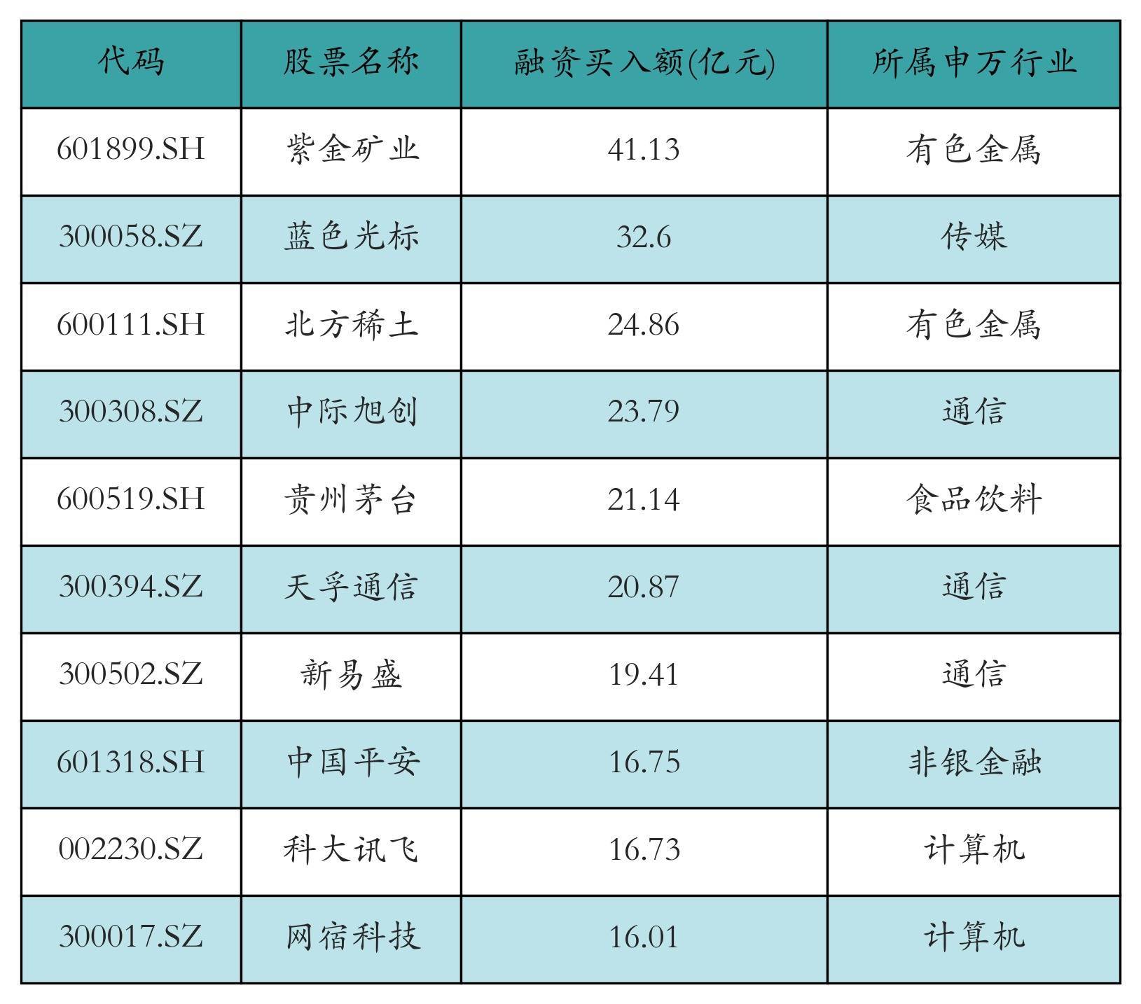 两市共有3480只个股有融资资金买入,其中紫金矿业、蓝色光标、北方稀土排名前三,买入金额分别41.13亿元、32.6亿元、24.86亿元。融资买入额前10个股详情见下表: