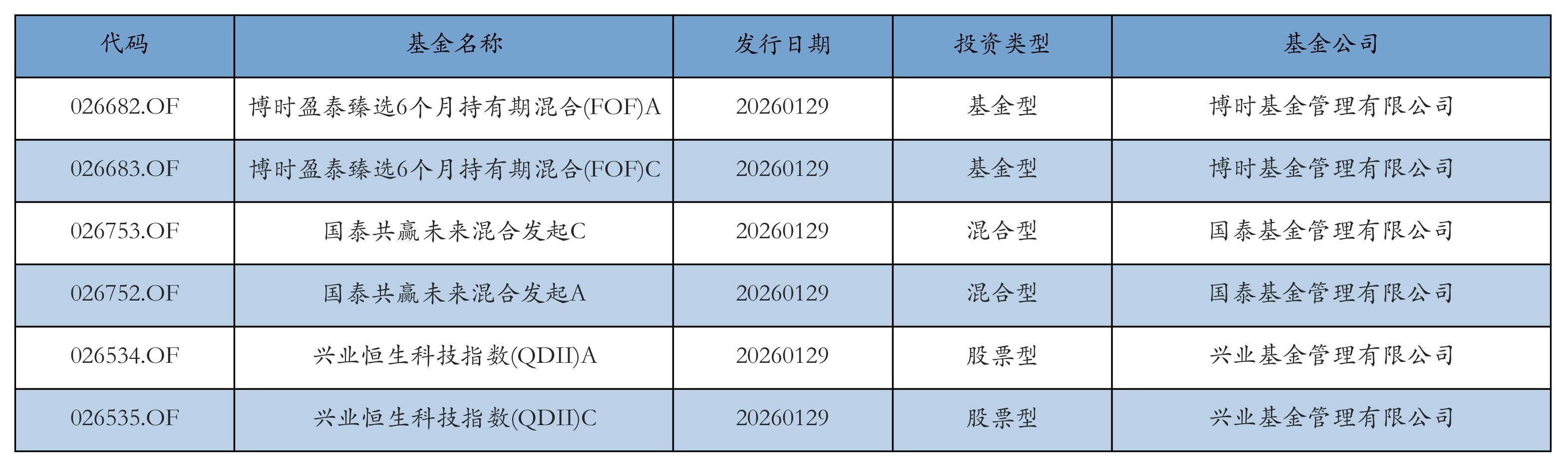 昨日有6只新基金发行,分别为:博时盈泰臻选6个月持有期混合(FOF)A、博时盈泰臻选6个月持有期混合(FOF)C、国泰共赢未来混合发起C、国泰共赢未来混合发起A、兴业恒生科技指数(QDII)A、兴业恒生科技指数(QDII)C,详情见下表: