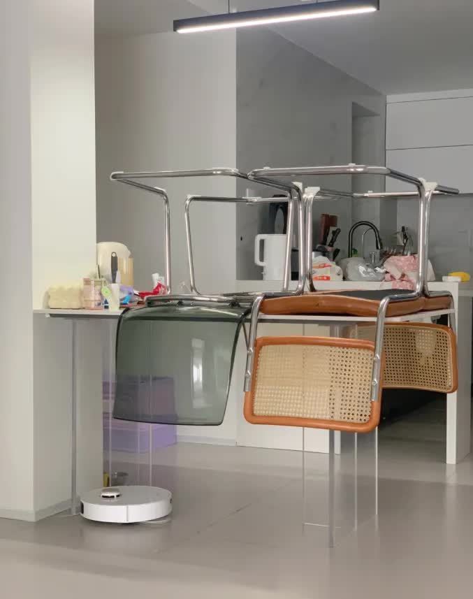 慎选不锈钢悬浮餐椅,否则每次扫地机器人工作时,都需将其放到餐桌上,因其沉重,不仅无法翻越餐椅下方障碍,还会无形增加家务,无法解放双手。