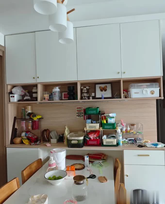 心心念念的餐边柜,入住后却成了杂物柜。盲目跟风做了许多开放格,还安装玻璃柜门,入住后高级感全无,杂物堆积却更明显。