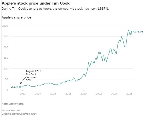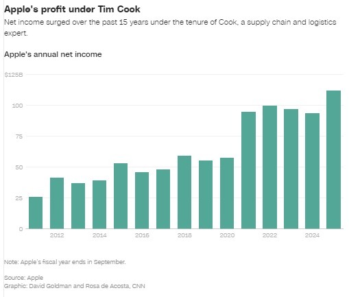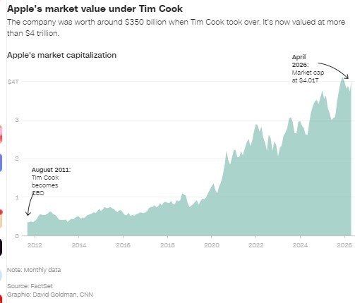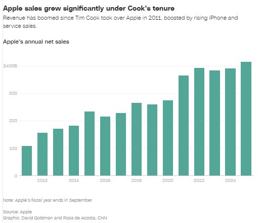 无论以何种标准衡量,库克的职业生涯都堪称卓越 —— 就连前总统唐纳德・特朗普周二也在 “真实社交” 平台上炫耀,自己首个任期内,“苹果掌门人主动致电求助某件未公开事宜,我对此深感自豪”。